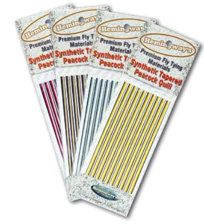 Hemingway’s Synthetic Tapered Peacock Quills are made from a very thin self-adhesive flexible vinyl based material. Available in 10 colors each strip is tapered from a incredibly fine 0.2mm. up to 2.2mm. and 100mm. in length which will basically tie the body of any pattern. From the smallest patterns in the #20’s and even smaller, to your largest patterns. They utilize an amazingly detailed gradient print which gives each quill one dark edge and one light edge you can’t even get that from a natural quill. These are a great match for almost any pattern from midges, buzzers, and nymphs to your favorite dry fly pattern these quills won’t crack, break, or split leaving you with a failing fly at the worst possible time. No pre-treatment needed our quills will change your entire view on the hassle of using quill bodies! Also available on a clear foil backing which will enable you to partially see through these quills to the underbody giving your flies that amazingly sought after translucent look.